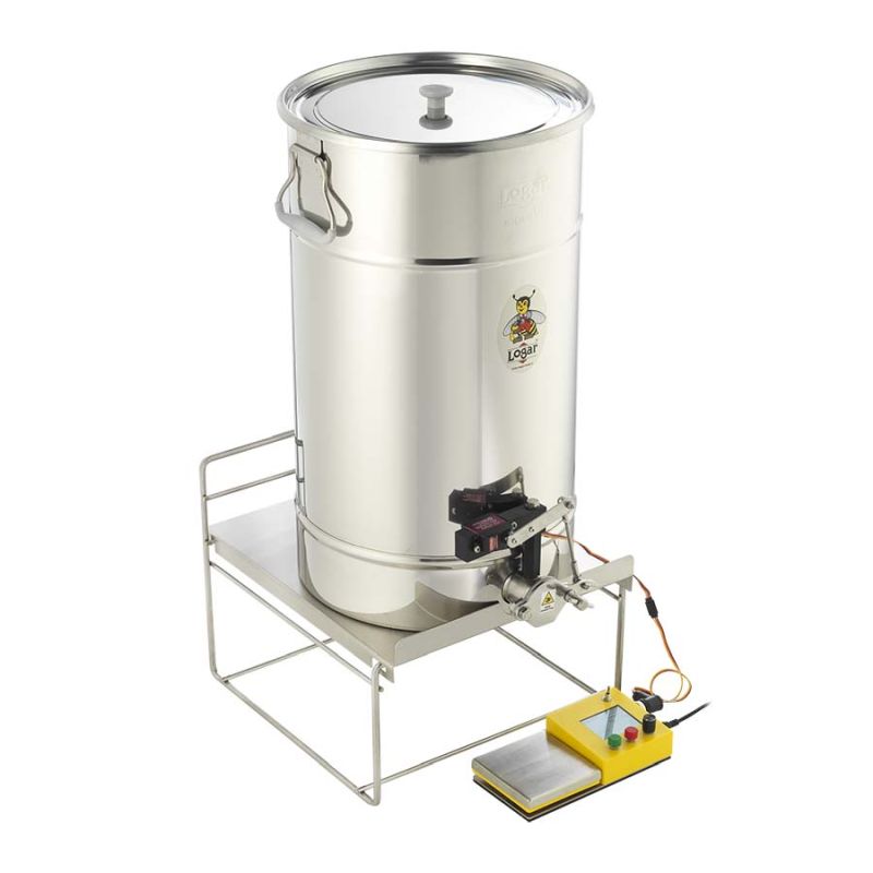 L’unité de remplissage est montée sur notre cuve de 50 kg à fond incliné pour un écoulement facilité. Un servomoteur installé sur la conduite de sortie commande la fermeture du couvercle du robinet pince. La remplisseuse est conçue pour le remplissage semi-automatique de miel ou d’autres liquides à consistance visqueuse.