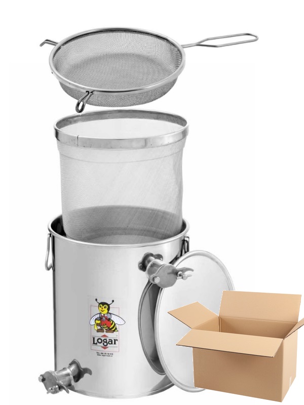- Équipement : 2 robinets-pince soudés (robinet-pince supérieur XL pour débit de miel augmenté), tamis intérieur fin en tissu grillagé inox