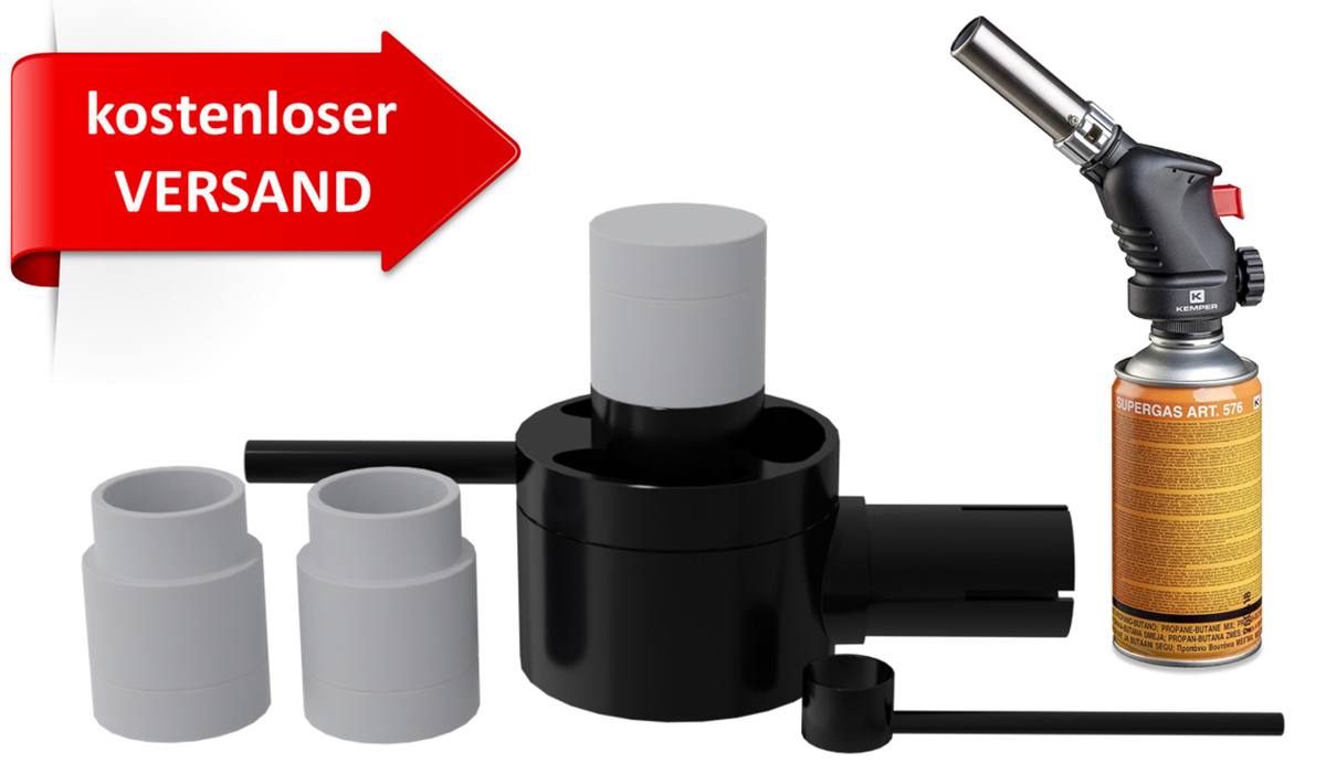 Die drei mitgelieferten Dosierkappen ermöglichen es Ihnen, die Sublimation ohne Wartezeit und ohne die Gefahr, sich zu verbrennen, fortzusetzen. So steht immer eine Kappe für Sublimation zur Verfügung, während die zweite Kappe mit Oxalsäure befüllt werden kann und die dritte gekühlt wieder einsatzbereit ist.