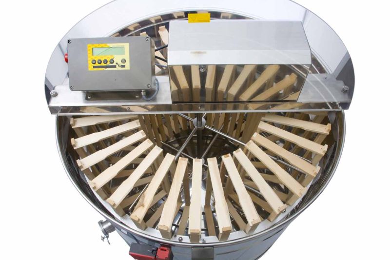 56-Waben Radialhonigschleuder von Logar (Art. Nr. 4575), mit Motorantrieb 750 W / 230 V und vollautomatischer Steuerung. Die Maschine verfügt über eine eingebaute Sicherheitssperre, die verhindert, dass der Deckel während des Betriebs geöffnet werden kann. Die Schleuder hat zwei rostfreie Quetschhähne (Ø 2''). Der untere Quetschhahn ist am tiefstmöglichen Punkt angebracht, damit der gesamte Honig aus der Honigschleuder abfließen kann. Alle Teile, die mit dem Honig in Berührung kommen, bestehen aus lebensmittelzugelassenen Materialien. Der Deckel ist aus durchsichtigem Acrylglas, sodass Sie den Schleuderprozess jederzeit beobachten können.
